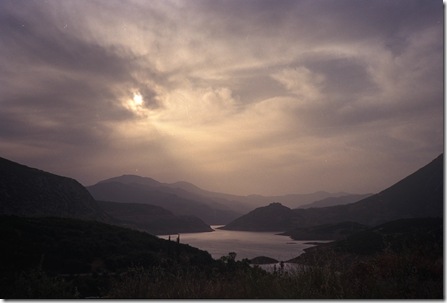 Τα όρη συμπλέκουν τας καμπύλας των και ομοιάζουν προς βίαια γιγαντιαία κύματα . Βαθεία τομή χαράσσει βάραθρον μεταξύ των ορέων Κόραξ και Γκιώνα και σημιεοί την κοίτην του Μόρνου . Τα όρη αυτά αποτελούν ίδιον κόσμον και θα ήτο ματαία η προσπάθεια περιγραφής των . Εν τούτοις , είναι εύκολον να διακρίνη σαφείς ζώνας . Υψηλά , εις τας δύο πλευράς του βαράθρου υπάρχουν τεράστιοι τεφροί βράχοι οι οποίοι λάμπουν εις τον ήλιον . Αι επιφάνειαί των είνα ανώμαλοι , διακόπτονται υπό σχσμών ως υπό πτυχών , και εις τας κοιλότητας υπάρχει χιών και σκιαί . Το σύνολον διαγράφεται ως δαντέλλα επί του καθαρού γαλανού ουρανού .