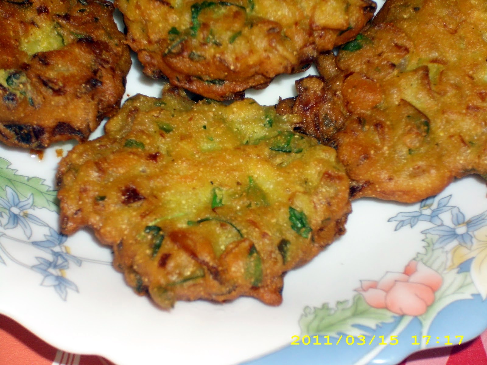 Σε ένα μπωλ ρίχνω όλα τα υλικά ψιλοκομμένα, στο τέλος ρίχνω το ρεβυθάλευρο και τη σόδα και κάνω πηχτό κουρκούτι.
