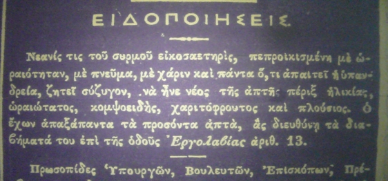 Μια σπάνια και θαρραλέα, θα έλεγα, για την εποχή της αγγελία του 1869 (Πινακωτή)