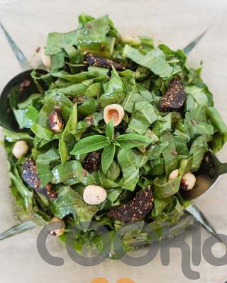 1. Πλένουμε καλά τα σέσκουλα και τα ψιλοκόβουμε. Ανακατεύουμε τα σέσκουλα μαζί με τη συκομαΐδα, τα φύλλα βασιλικού, τη βινεγκρέτ, τους ξηρούς καρπούς, αλάτι και πιπέρι.