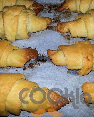 - Πλάθουμε σε 6 ή 7 μπάλες τη ζύμη και ρίχνουμε τη μισή ποσότητα της μαργαρίνης στο ταψί σε μικρά κομματάκια. Ανοίγουμε κάθε μπάλα και την κόβουμε σε 8 τρίγωνα. Βάζουμε λίγη απο τη γέμιση τυλίγουμε και αλείφουμε με αυγό. Επαναλαμβάνουμε τη διαδικασία για τις υπόλοιπες μπάλες. Θα γεμίσουμε 2 ταψιά. Ψήνουμε στους 180οC μέχρι να ροδίσουν.