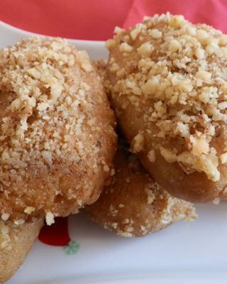 - Τα στρώνουμε σε πιατέλα και τα πασπαλίζουμε με λίγη κανέλα και με καρύδια κοπανισμένα.